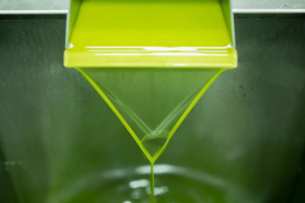 ↑在甘肅省隴南市武都區(qū)一家油橄欖加工企業(yè),一股特級(jí)鮮榨橄欖油正在流出。