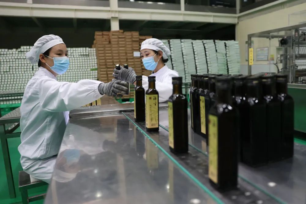 ↑在甘肅省隴南市武都區(qū)一家油橄欖加工企業(yè),工作人員在生產(chǎn)線(xiàn)上作業(yè)。